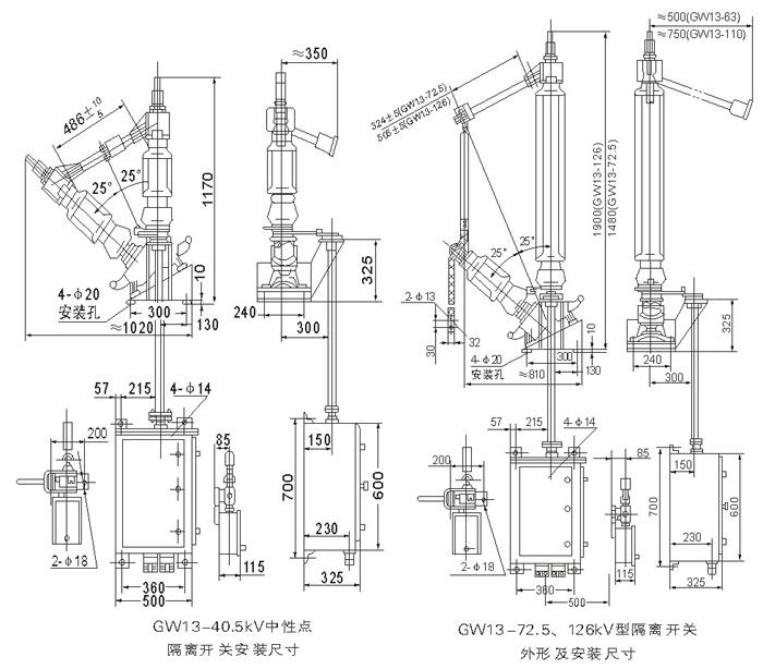 | 隔離開關(guān)由支架、底座、支柱絕緣子、觸頭、接線板等部分組成。支柱絕緣子及導(dǎo)電部分安裝于底座上,兩支柱絕緣子交角為50°。底座固定在傾斜25°的支架上。支架上裝有與操動(dòng)機(jī)構(gòu)相連接的軸?膳銫S17-G手動(dòng)操作機(jī)構(gòu),也可配用CJ6電動(dòng)機(jī)構(gòu)。 | ||||||||||||||||||||||||||||||||||||||||||||||||||||||||||||||||