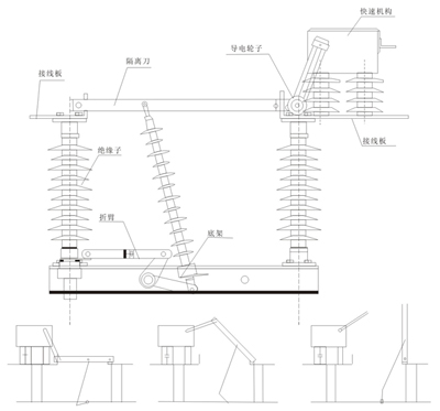 (2)總體布局(如圖示) 滅弧室裝于進(jìn)線端的靜觸頭上,在合閘位置時(shí)與主導(dǎo)電回路——靜觸頭并聯(lián),這樣保證開(kāi)關(guān)具有很強(qiáng)的過(guò)載承受能力以及可靠的導(dǎo)電性(此時(shí)相當(dāng)于一臺(tái)關(guān)合的隔離開(kāi)關(guān))。隔離斷口用隔離刀相連。帶動(dòng)滅弧室動(dòng)作的是一快速機(jī)構(gòu),由隔離刀動(dòng)作帶動(dòng)快速機(jī)構(gòu)上的導(dǎo)電叉子為快速機(jī)構(gòu)儲(chǔ)能,導(dǎo)電叉子也在關(guān)合與開(kāi)斷的瞬態(tài)過(guò)程中起導(dǎo)通電流作用。為了使隔離刀也能快速動(dòng)作,在操作隔離刀的三軸上設(shè)有一過(guò)中彈簧,保證隔離刀在開(kāi)斷和關(guān)合過(guò)程中轉(zhuǎn)到一定角度能快速動(dòng)作。 (3)動(dòng)作原理(如圖示) 在開(kāi)關(guān)處于關(guān)合狀態(tài)時(shí),電流從靜觸頭流入,分兩路,一路流過(guò)真空滅弧室—導(dǎo)電叉子至隔離刀(此路電流極小),另一路從靜觸頭直接至隔離刀,從隔離刀至出線板流出。 分?jǐn)噙^(guò)程:主軸在電動(dòng)機(jī)構(gòu)的帶動(dòng)下轉(zhuǎn)動(dòng),通過(guò)絕緣操作桿使隔離刀向上轉(zhuǎn)動(dòng),隔離刀脫離靜觸頭,電流全部經(jīng)真空滅弧室—導(dǎo)電叉子流過(guò),隔離刀口不起唬隔離刀帶動(dòng)導(dǎo)電叉子繼續(xù)向上運(yùn)動(dòng),當(dāng)其運(yùn)動(dòng)到一定角度(43°)時(shí),叉子觸發(fā)笨體內(nèi)快速機(jī)構(gòu),帶動(dòng)真空滅弧室快速分?jǐn)嚯娏鳎娐诽幱陂_(kāi)路狀態(tài)。最終隔離刀上的滑輪和導(dǎo)電叉子在無(wú)負(fù)狀態(tài)下分離,形成明顯的可見(jiàn)隔離斷口,完成分閘操作。 開(kāi)關(guān)的關(guān)合過(guò)程的動(dòng)作順序與開(kāi)斷過(guò)程相反。 在合閘位置時(shí),由于隔離刀口和靜觸頭之間的線路中阻較叉子和滅弧室構(gòu)成的線路電阻小得多,電流主要從隔離刀口靜觸礁頭構(gòu)成的電路流過(guò),在正常通電狀態(tài)溫升校真滅弧室回路在隔離刀閘狀態(tài)通過(guò)的電流很小,所以本產(chǎn)品具有可靠的電氣性能和突出的承載能力。 |