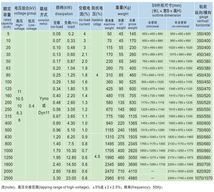 S9、S9-M系列三相油浸式變壓器采用了新型絕緣結(jié)構(gòu)和提高抗短路能力結(jié)構(gòu)等多項(xiàng)科研成果,其性能達(dá)到國際先進(jìn)水平. 與S7系列相比較,空載損耗平均降低10.25%,空載電流降低37.9%,負(fù)載損耗平均降低22.4%, 是節(jié)能型產(chǎn)品的更新?lián)Q代產(chǎn)品