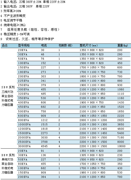 我公司最新上市的節(jié)能型三相補(bǔ)償穩(wěn)壓器。經(jīng)過(guò)嚴(yán)格測(cè)試各項(xiàng)指標(biāo)達(dá)到國(guó)家規(guī)定的要求。該SBW系列三相補(bǔ)償穩(wěn)壓器是目前我國(guó)用戶最多,實(shí)用性最廣的一款穩(wěn)壓器之一!客戶遍布河北、甘肅、福建、黑龍江等20多個(gè)省100多個(gè)城市。由于該穩(wěn)壓器實(shí)用性廣,性能穩(wěn)定,價(jià)格實(shí)惠,操作簡(jiǎn)單而深受客戶喜歡! 一、簡(jiǎn)介 SBW系列穩(wěn)壓器是一種大功率輸出,高性能電源穩(wěn)壓系統(tǒng)。它的獨(dú)特設(shè)計(jì)在于利用迭加原理、補(bǔ)償辦法,使系統(tǒng)輸出穩(wěn)壓源的功率大部分接受接取自電網(wǎng)。故而,它具有,體積小、重量輕、結(jié)構(gòu)緊湊、高效率,低損耗、穩(wěn)壓范圍寬,波形畸變小、能長(zhǎng)時(shí)間連續(xù)運(yùn)行等特點(diǎn)。 二、適用領(lǐng)域 ★CNC生產(chǎn)設(shè)備 ★進(jìn)口SMT ★印刷機(jī)器 ★放電加工機(jī) ★自動(dòng)插件機(jī) ★塑膠射出機(jī) ★鐳射切割機(jī) ★激光切割機(jī) ★精密測(cè)量?jī)x器 ★醫(yī)療器械 ★生產(chǎn)流水線 ★輕紡設(shè)備 三、結(jié)構(gòu)原理 電動(dòng)調(diào)壓器、控制器、補(bǔ)償變壓器組成一個(gè)閉環(huán)系統(tǒng)。電動(dòng)調(diào)壓是執(zhí)行部件,當(dāng)電源電壓發(fā)生波動(dòng)時(shí),控制器同輸出端取得一偏差訊號(hào),經(jīng)與基準(zhǔn)比較、放大,驅(qū)動(dòng)伺服可逆電動(dòng)電機(jī),使電動(dòng)調(diào)壓器輸出給補(bǔ)償變壓器上的電壓大小和相應(yīng)發(fā)生變化,這一變化的電壓與電源電壓迭加后使輸出電壓獲得穩(wěn)定。 |